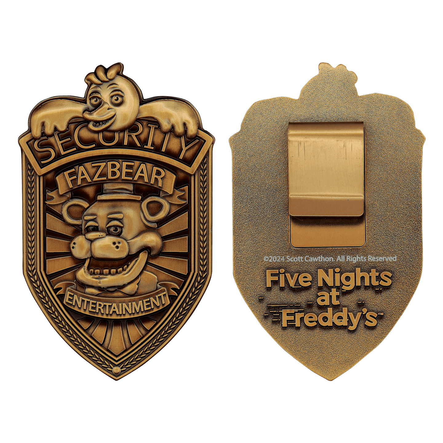 Created by Fanattiks, this officially licensed Five Nights at Freddy's replica security badge lets you step into the shoes of the brave security team at Freddy Fazbear's Mega Pizzaplex. Crafted with exquisite detail and finished in a striking antique gold, this collectible badge captures the essence of the terrifying night shifts in Five Nights at Freddy's: Security Breach.