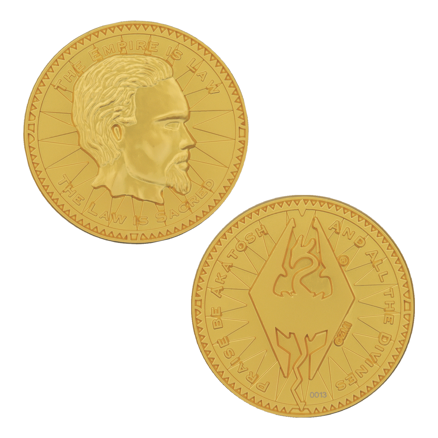 The Empire is law, the law is sacred!” Bring a piece of Tamriel into your collection with this Misty Gold Septim Coin replica. Intricately detailed and plated in distinctive misty gold, this coin captures the iconic currency of the Elder Scrolls universe.