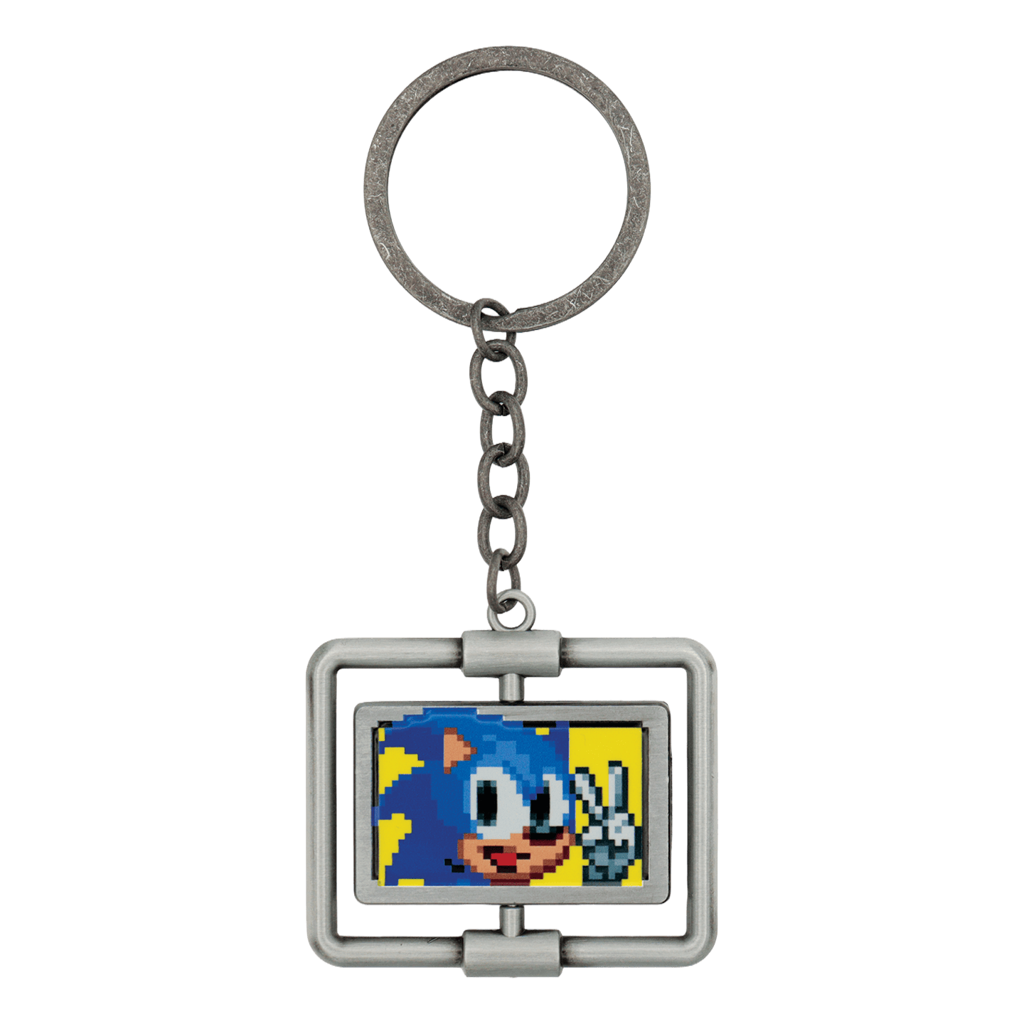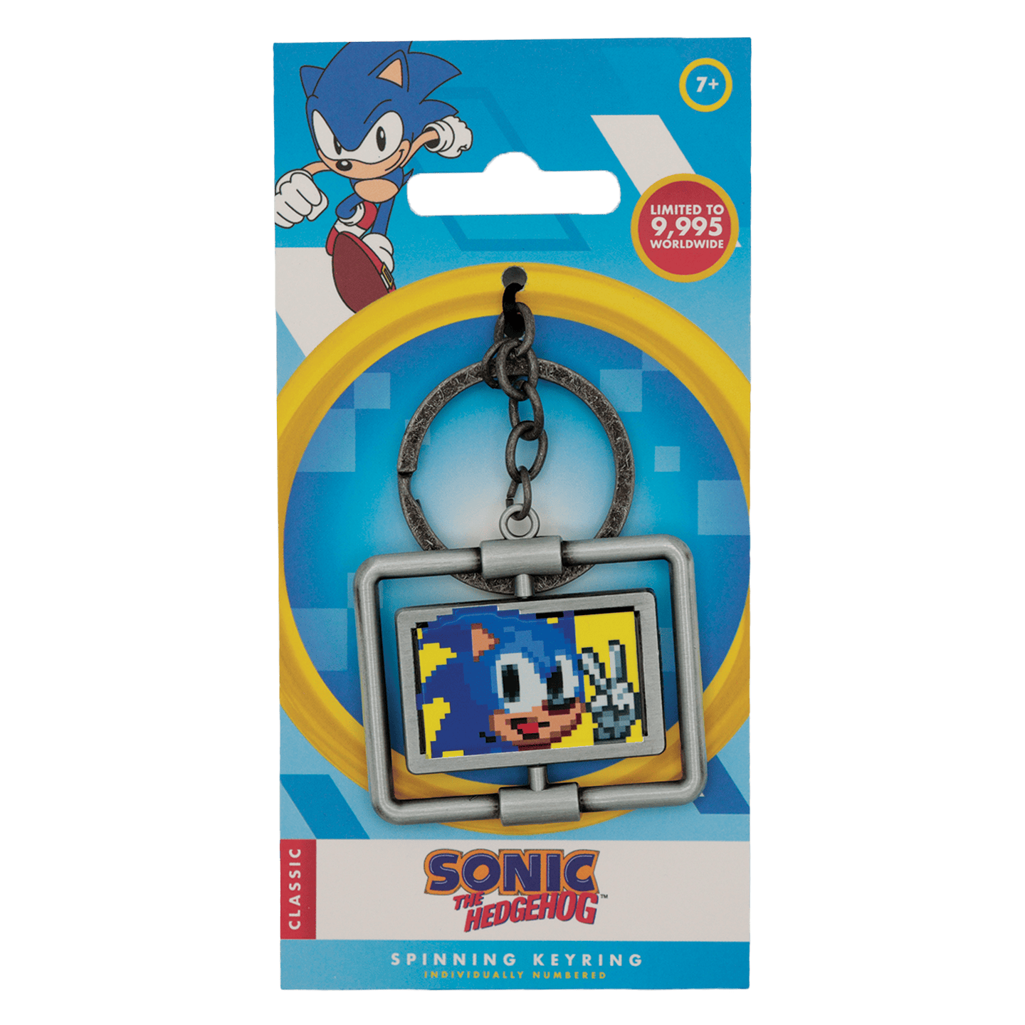 At the end of each stage in the very first Sonic game, released 35 years ago this year, you pass a sign of Dr. Eggman which flips round to reveal a picture of Sonic as he runs past it. This sign is created here in keyring form, with the central element rotating to show either Sonic or Eggman. Each one is numbered on the reverse and is limited to 9,995 worldwide.