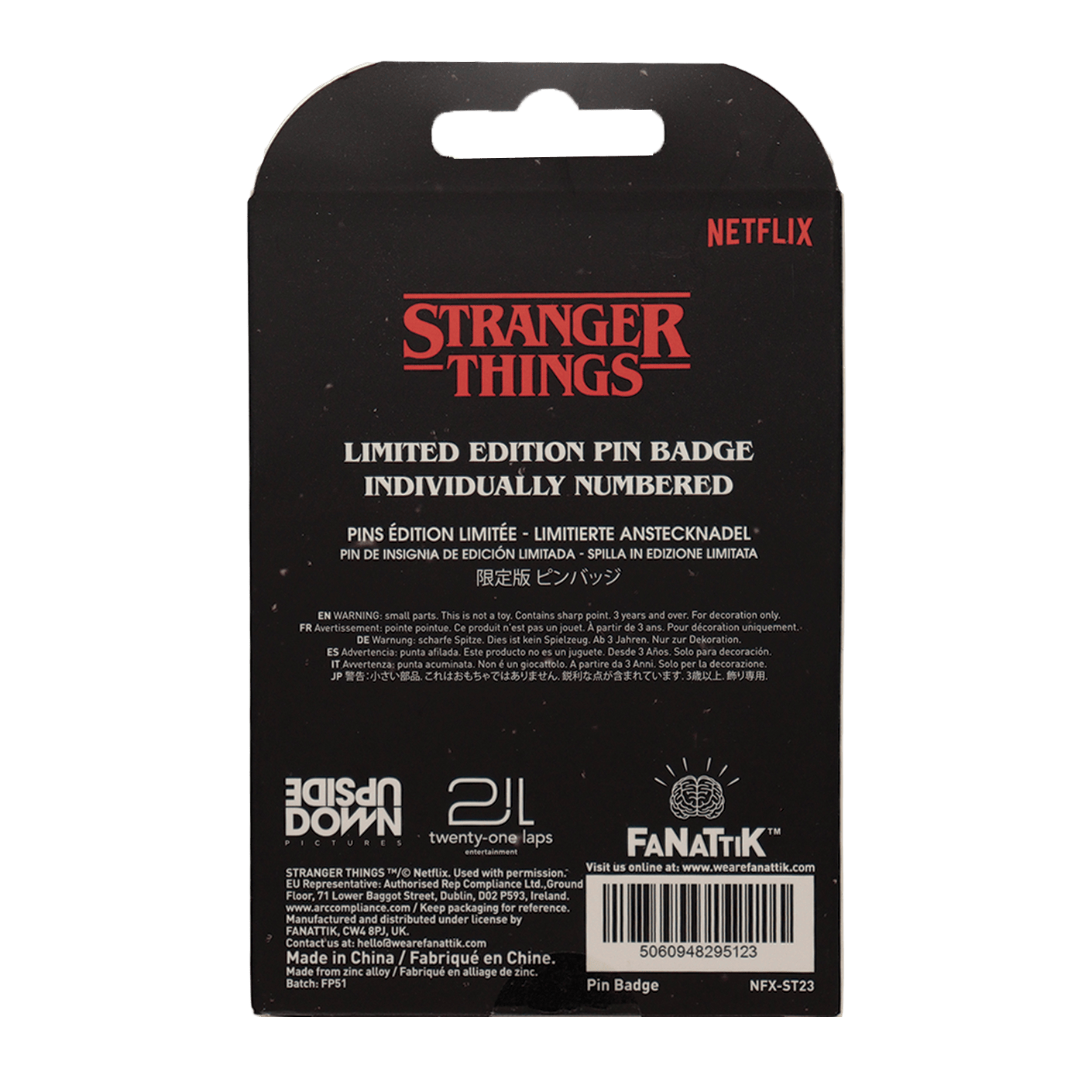 This limited edition Stranger Things pin badge is made from coloured metal and individually numbered to the reverse as one of XXXX worldwide.