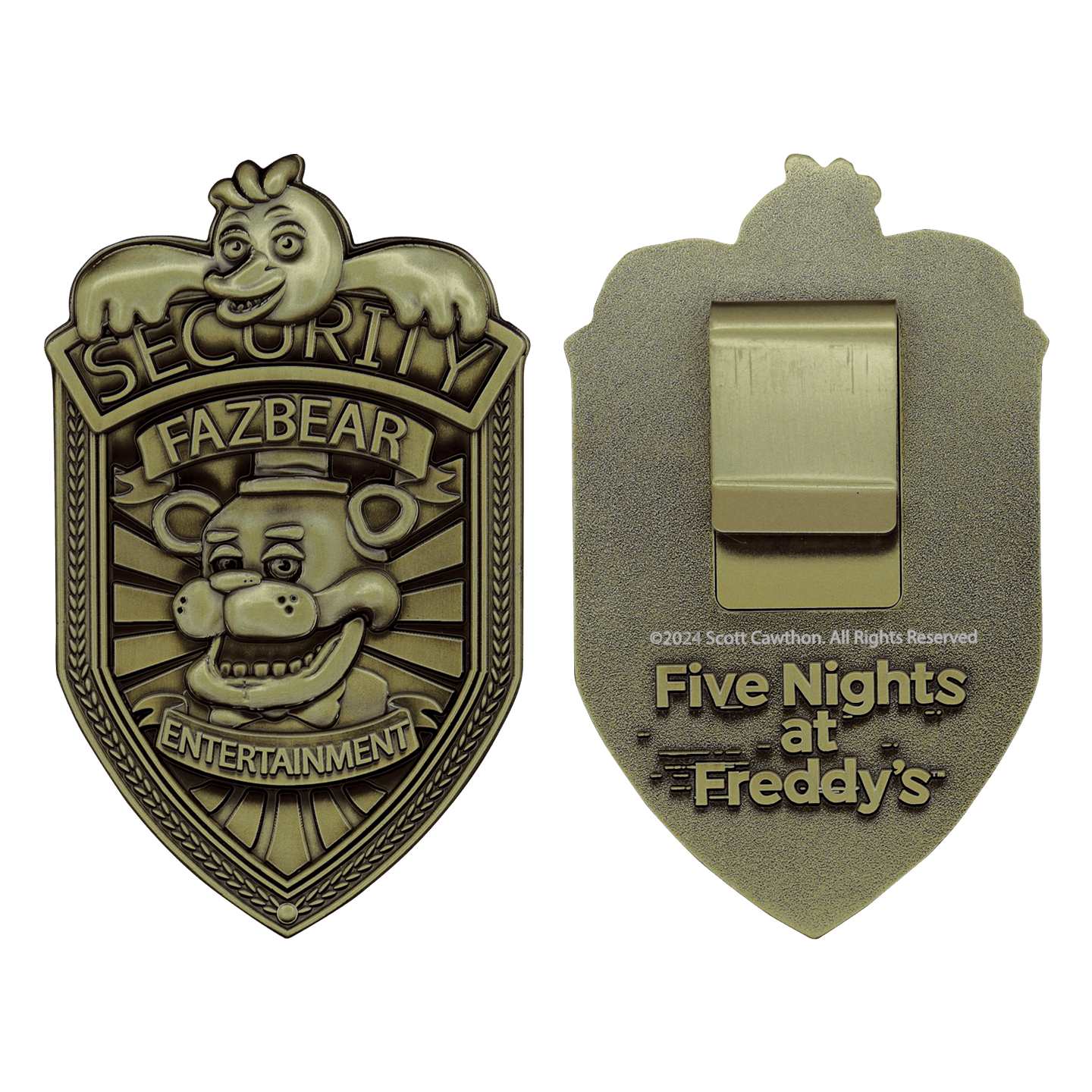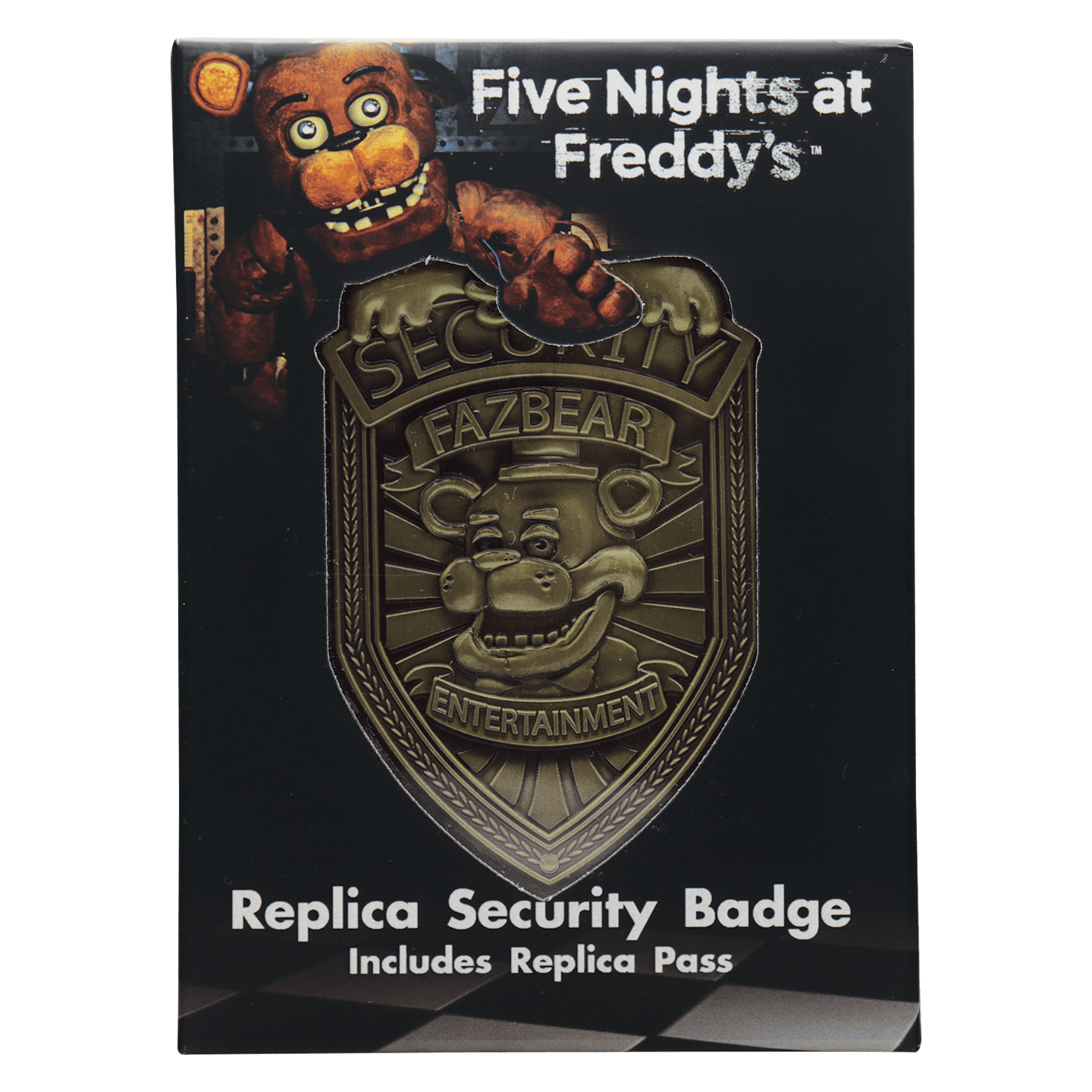 Now you can be part of the security team at Freddy Fazbear's, with this limited edition Five Nights at Freddy's replica security badge! With a clip on the back for displaying on your jacket, and finished in antique brass, the badge is limited to 5000 worldwide, is individually numbered on the reverse, and comes in a presentation box.