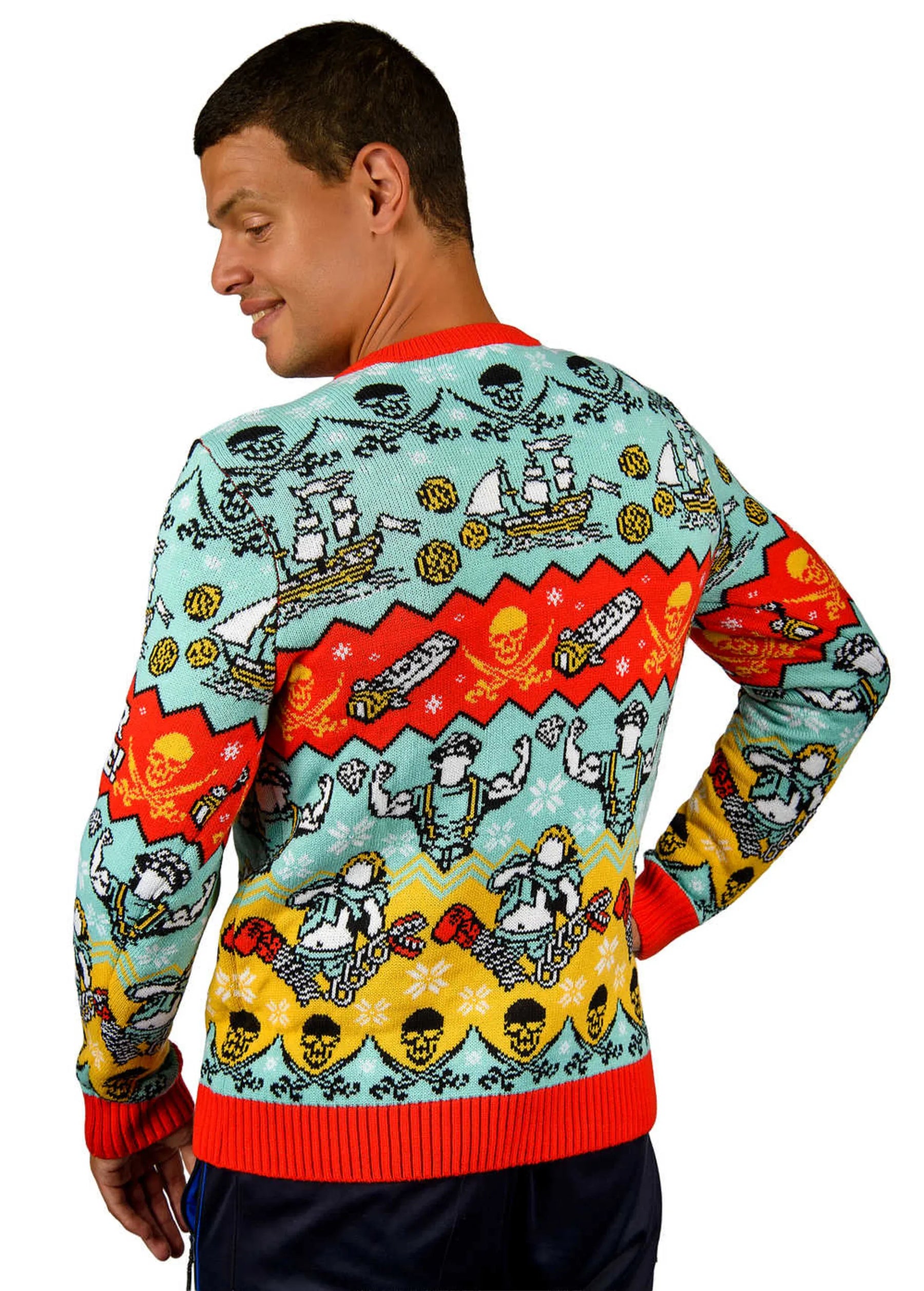 💬 Festive knit featuring iconic characters, pirate symbols, and slogans