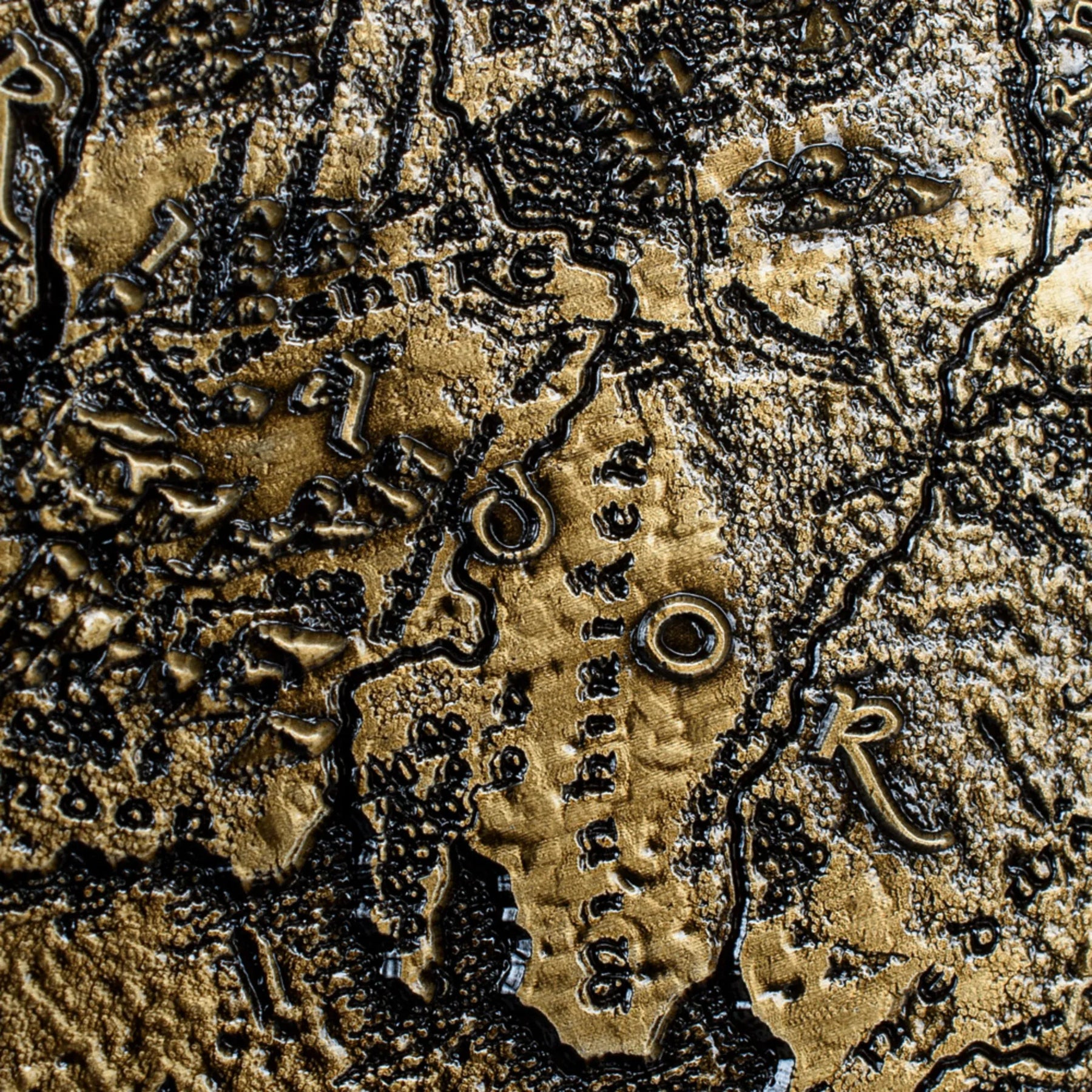 Step into the storied lands of Middle Earth with this Lord of the Rings Gold Metal Map, a striking collectible crafted to capture the legendary realm in rich detail. Designed with care and admiration for the world created by J R R Tolkien, this piece invites fans to relive the journeys of beloved characters and the sweeping history of the Ages. The map reflects the familiar geography of Middle Earth, allowing viewers to trace the paths of the Fellowship, the rise and fall of ancient kingdoms, and the distant regions where myth and memory intertwine.