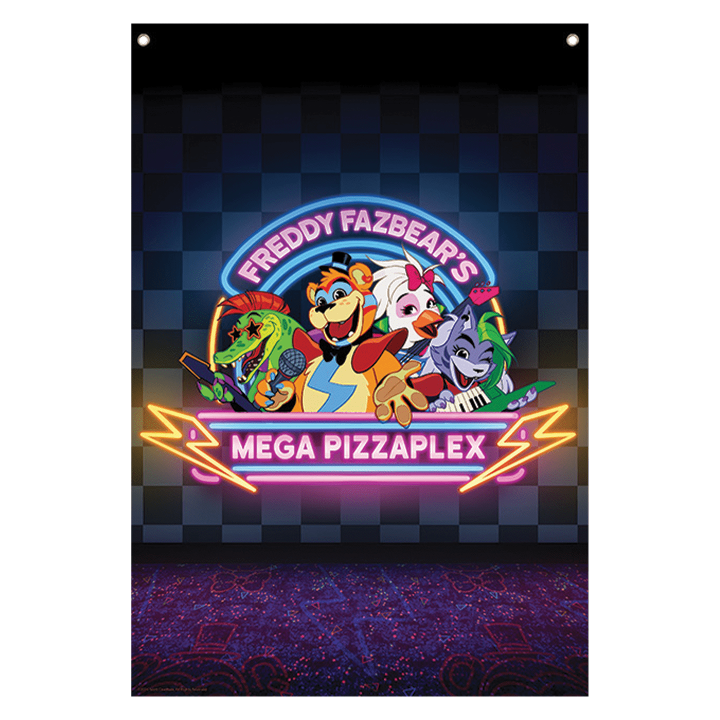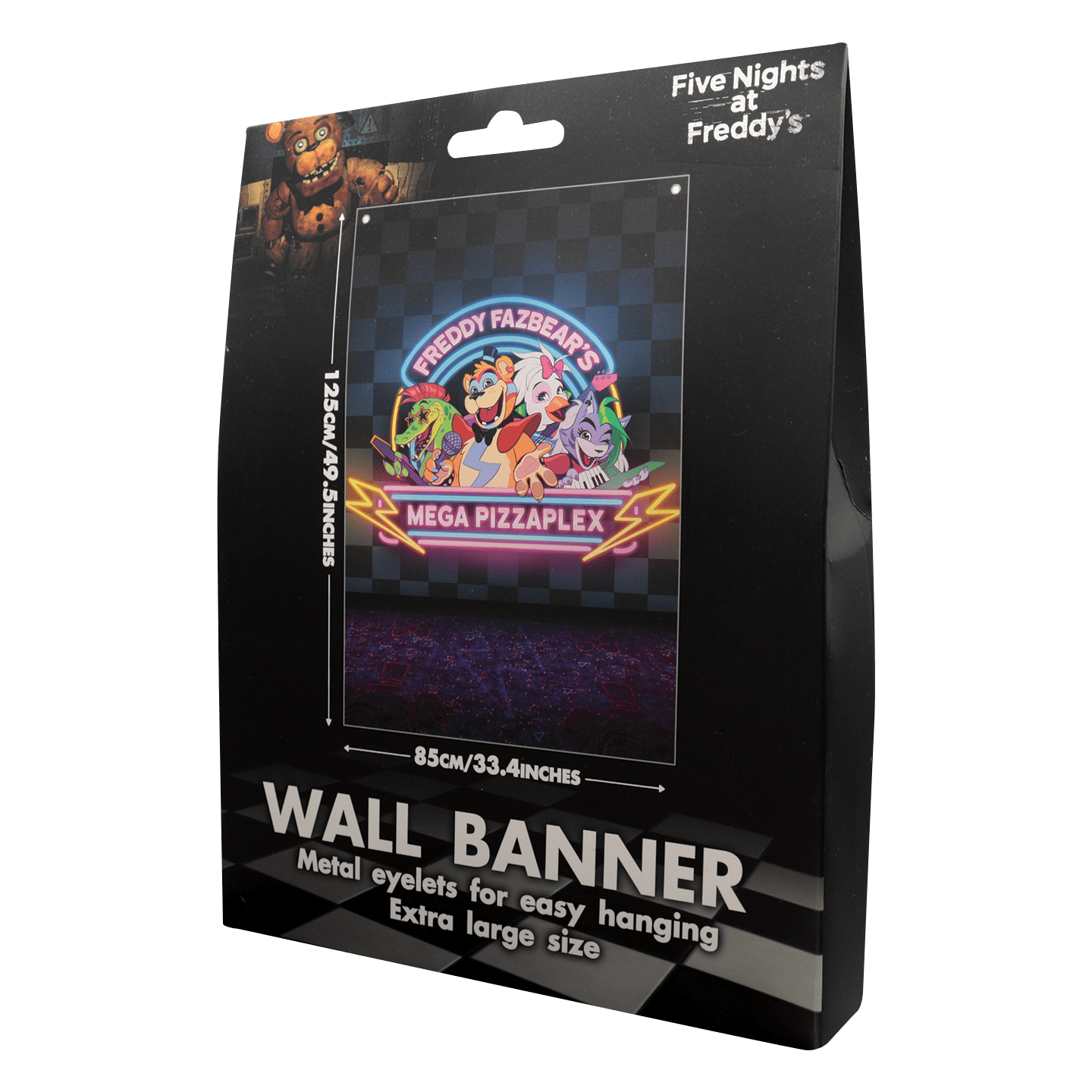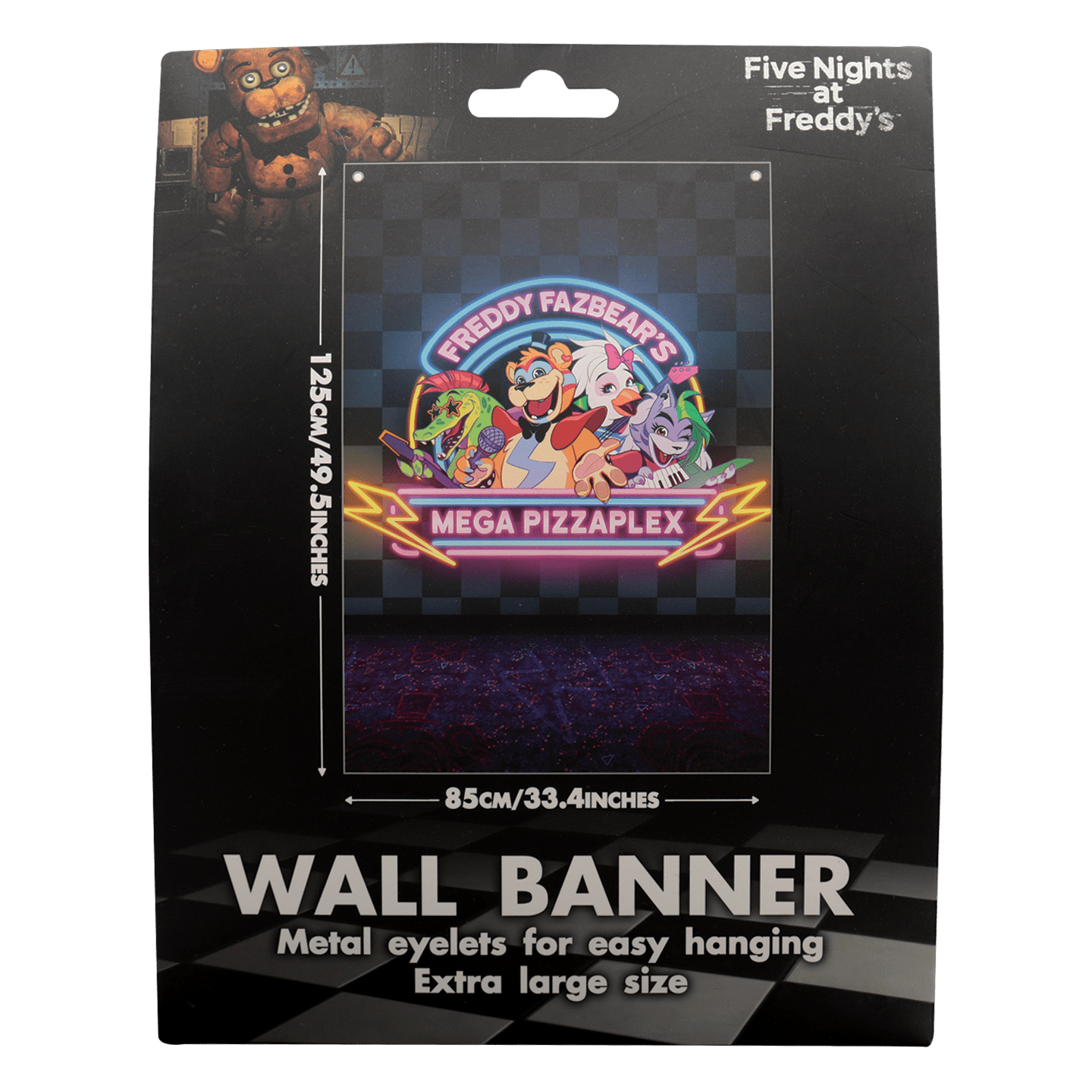 Showcasing the iconic characters from Five Nights at Freddy's: Security Breach—Glamrock Freddy, Glamrock Chica, Montgomery Gator, and Roxanne Wolf—this officially licensed wall banner brings the eerie atmosphere of Freddy Fazbear's Mega Pizzaplex to life. Perfect for fans of the series, the banner features the Pizzaplex logo and vibrant designs of the game's animatronics.